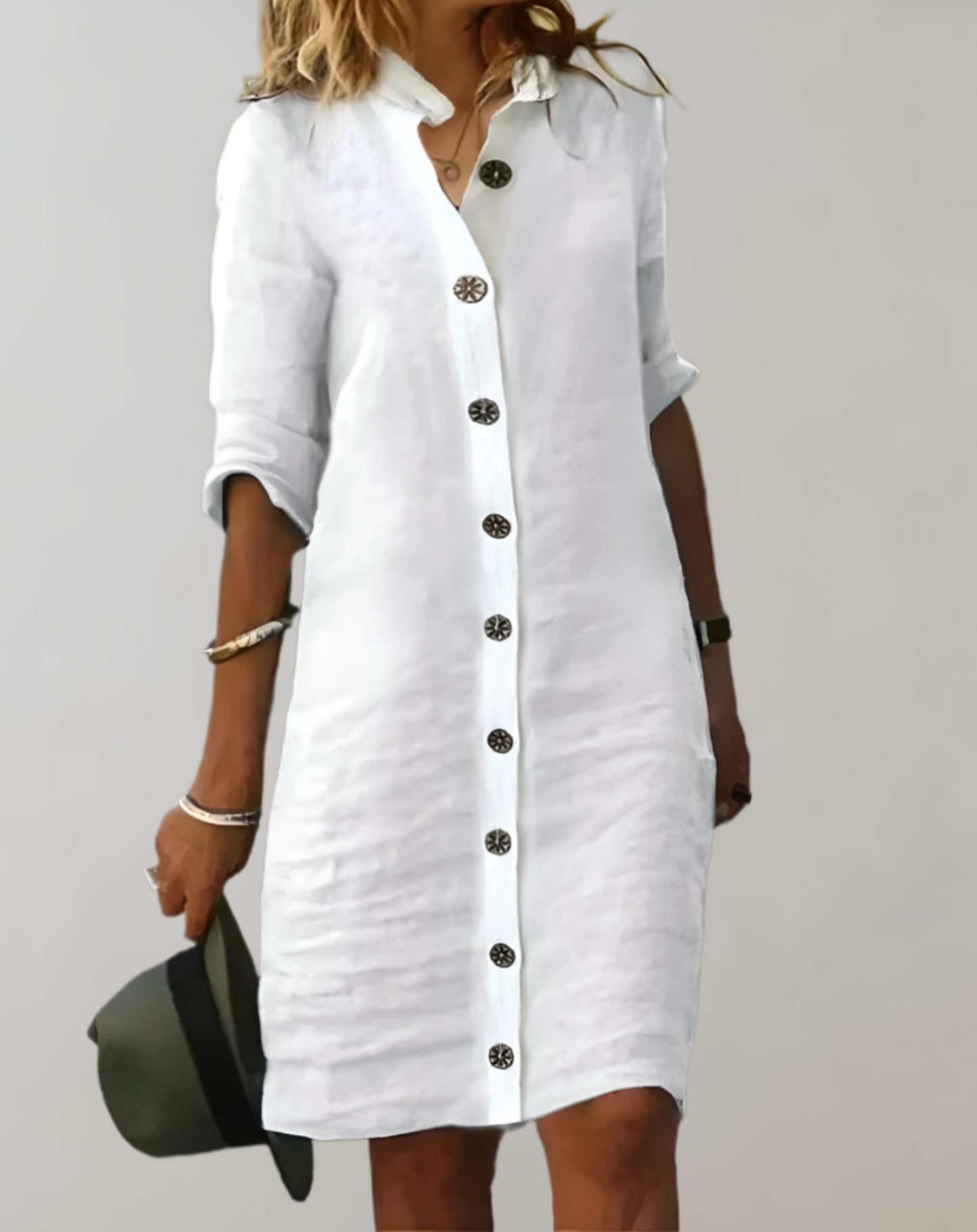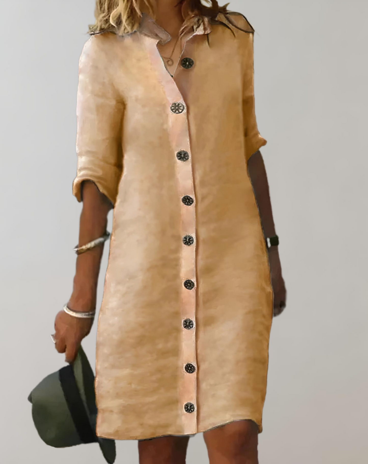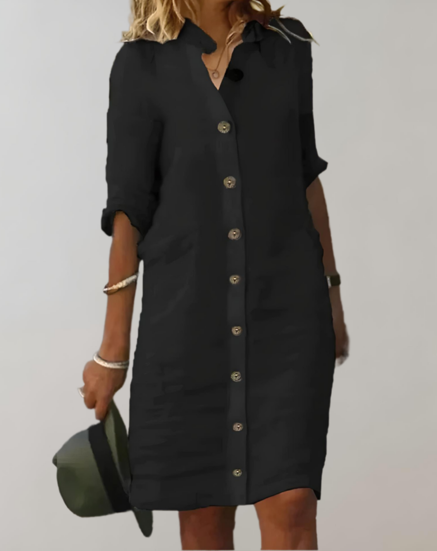 Elle | geknöpftes, knielanges Kleid mit 3/4-Arm und Stehkragen