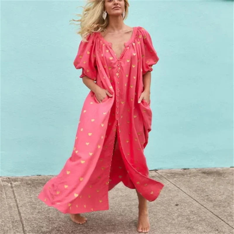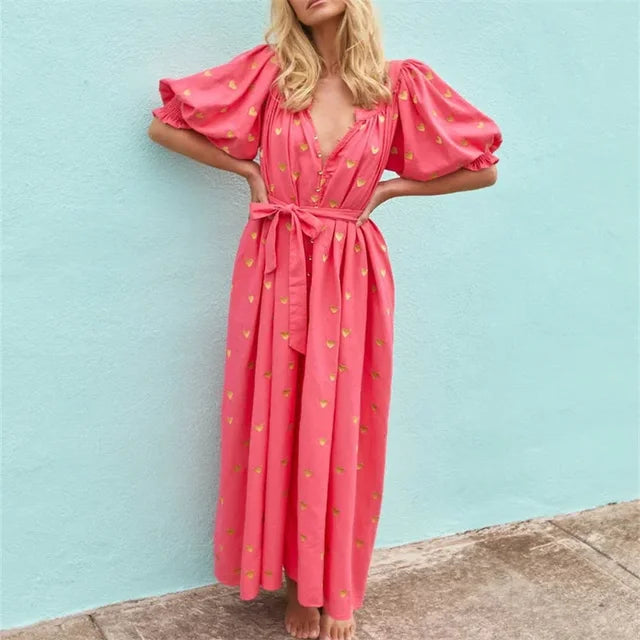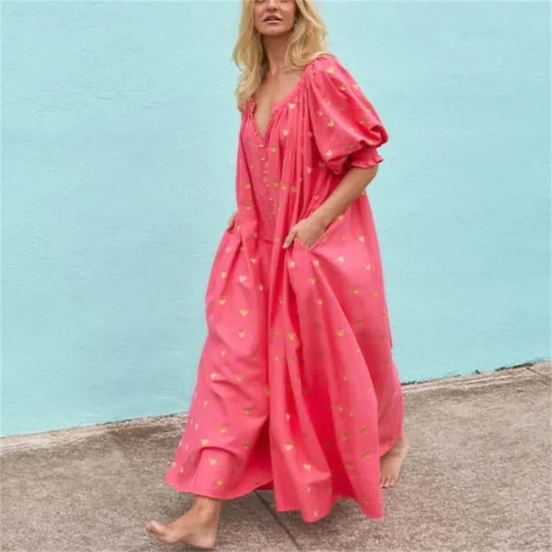 Tauchen Sie ein in süße Eleganz mit unserem Eloise - Maxi-Tunika-Kleid mit Puffärmeln und Herzmotiven, einem Inbegriff für legeren Sommercharme. Das Design mit einfacher Knopfleiste und Schnürung an der Taille bietet eine entspannte, aber dennoch maßgeschneiderte Passform, während die verspielten Halbärmel eine luftige Note hinzufügen. Dieses langgeschnittene Kleid in lockerer Silhouette, verziert mit entzückenden Herzmotiven, ist Ihre Wahl für mühelosen Stil und Komfort.