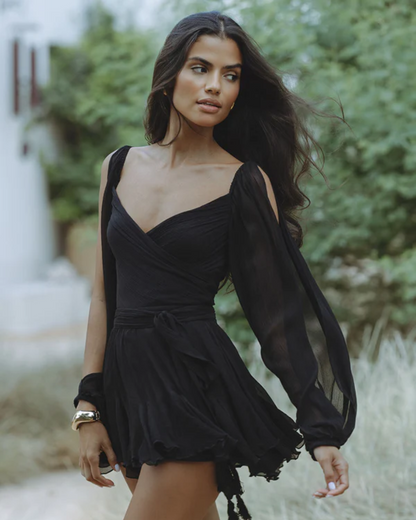 • Sinnliche und weiche Stoffe: Der Chiffonstoff umschmeichelt deine Figur auf eine Weise, die deine Kurven elegant hervorhebt, während die offenen Schultern einen verführerischen Blick auf deine Haut bieten.
