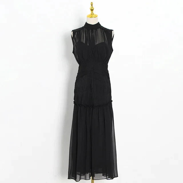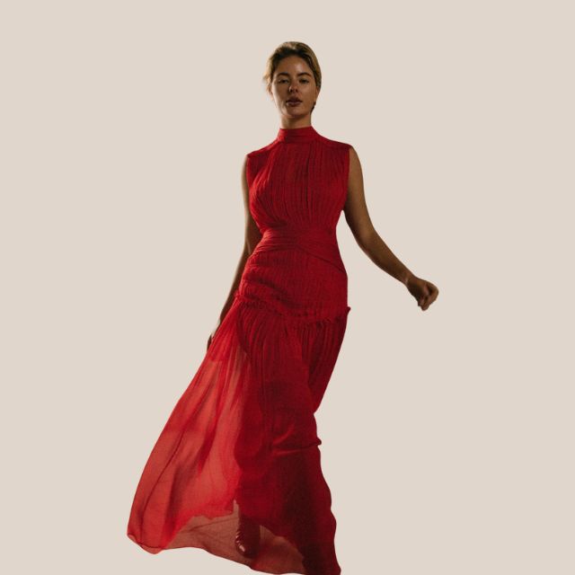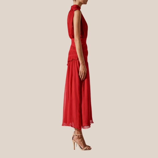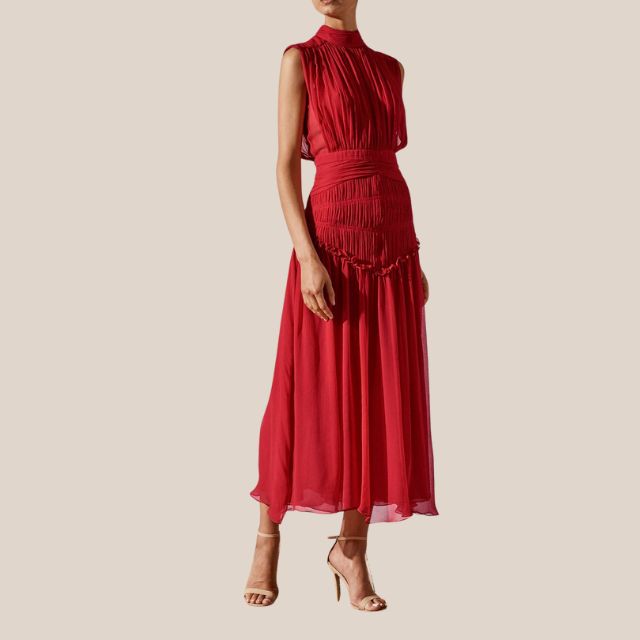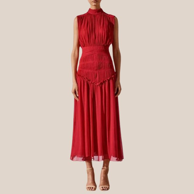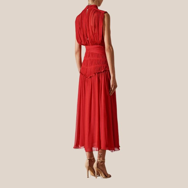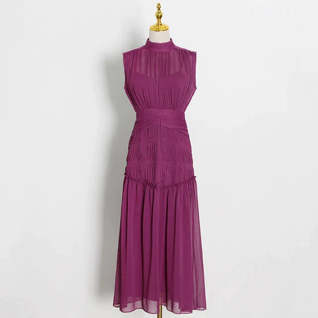 Das Viola - Gefaltetes Midikleid mit hohem Kragen ist eine beeindruckende Mischung aus zeitloser Eleganz, entworfen, um bei jeder besonderen Veranstaltung Eindruck zu machen. Für Komfort ohne Einbußen beim Stil gefertigt, verfügt dieses Kleid über ein plissiertes hochgeschlossenes Oberteil, eine taillierte Taille und einen fließenden Midilänge-Rock. Seine reiche Farbe und die eleganten Linien bieten einen anspruchsvollen Look, der klassisch und doch modern ist.